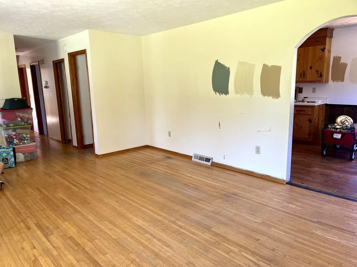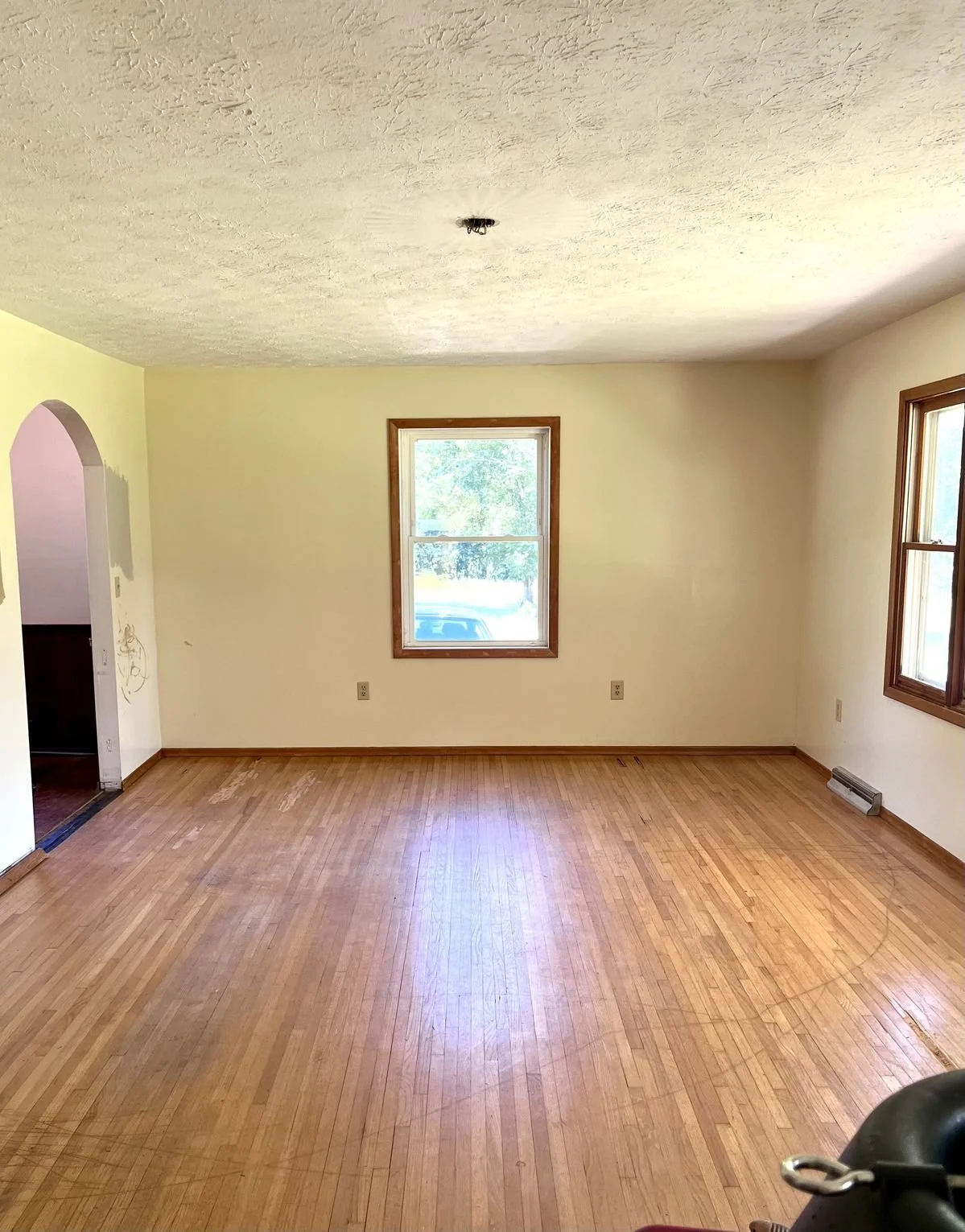 It has walls, y’all! Yes, finding a house that hasn’t been renovated is a plus to me. The walls are in tact, and there’s a lovely archway into the living room.