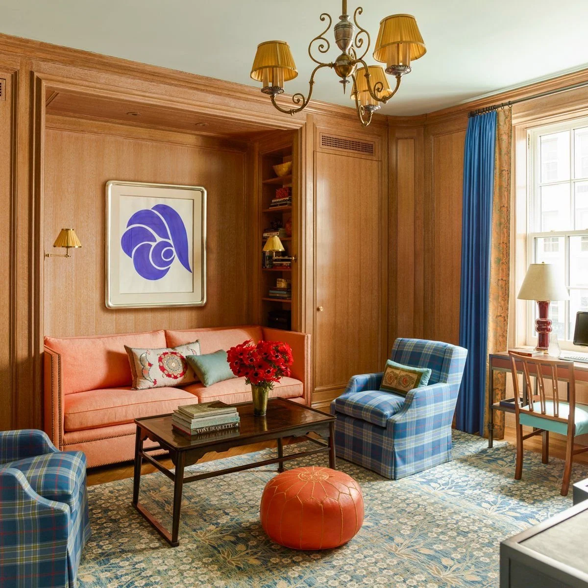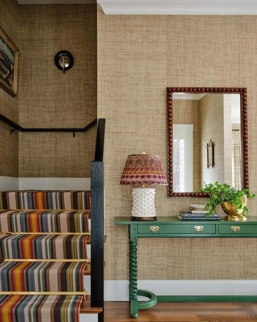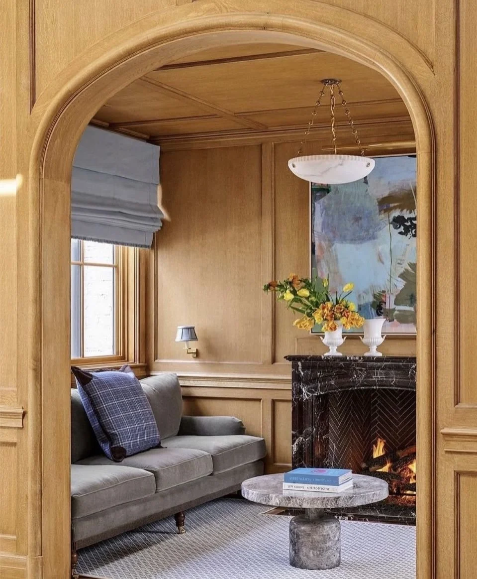 As I looked over my inspiration images, a lot of the rooms I was pulling had a lot of wood tones. Either a woven wallpaper or wood paneled walls.