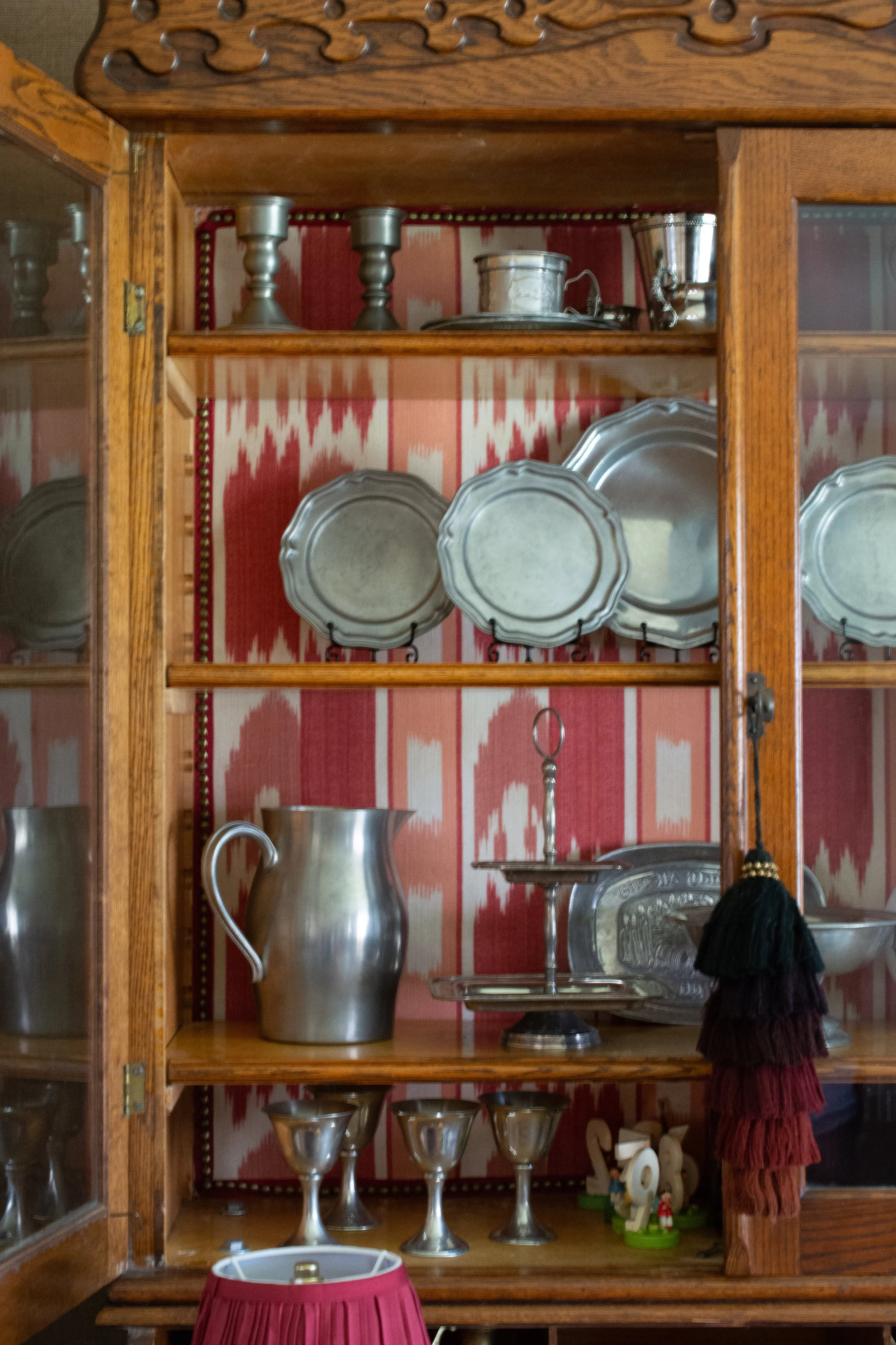 upholstered cabinet with pewter dishes in Amissville Virginia